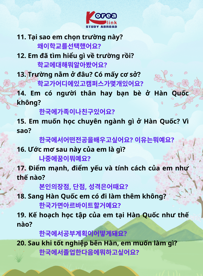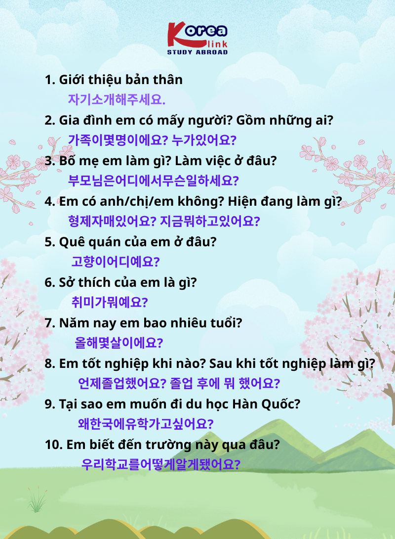 Dưới đây là 20 câu hỏi phổ biến nhất khi phỏng vấn Đại sứ quán du học Hàn Quốc, thường được hỏi bằng tiếng Hàn hoặc tiếng Việt.