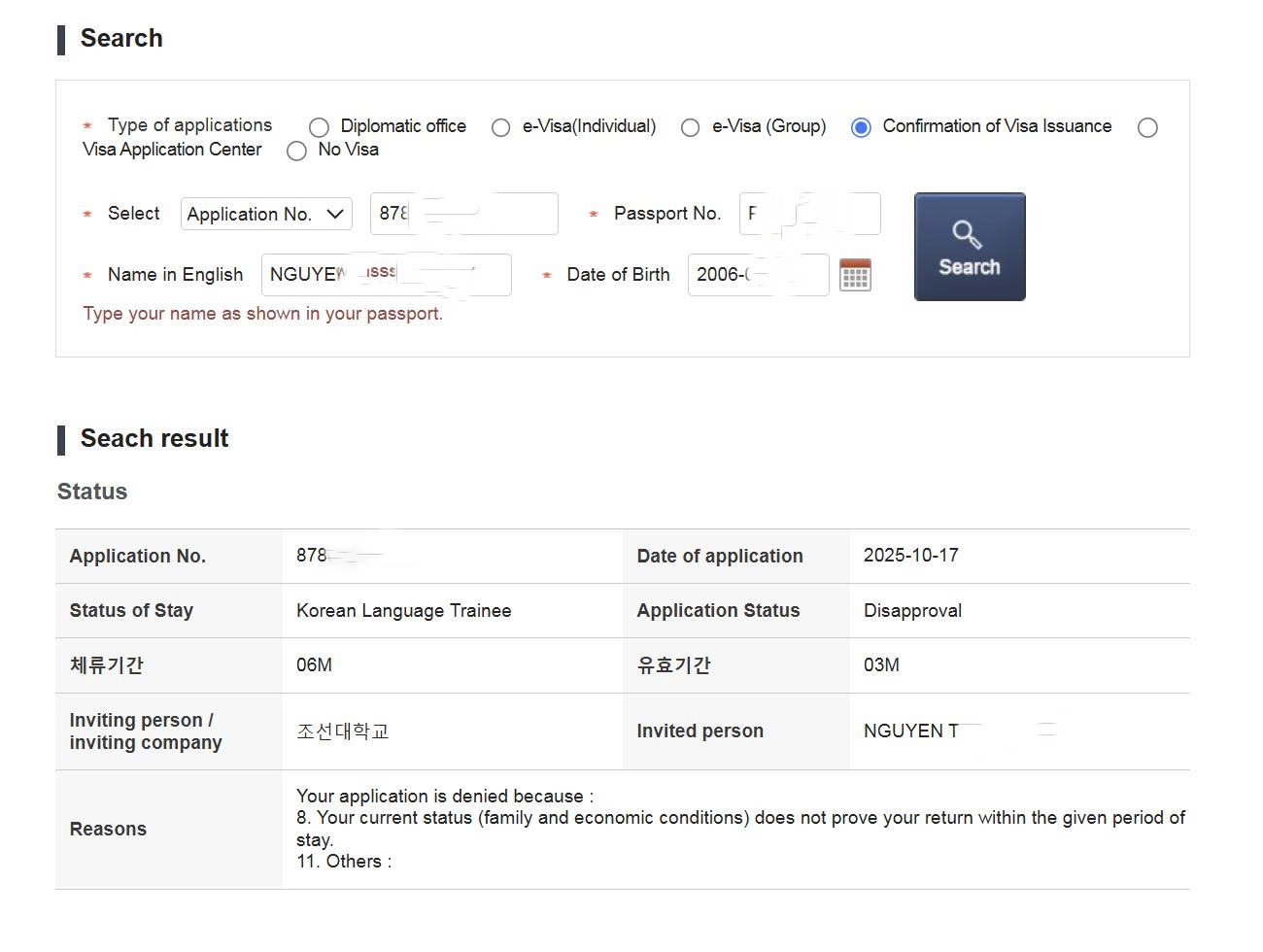 - Không chứng minh được tài chính ổn định để ở Hàn.