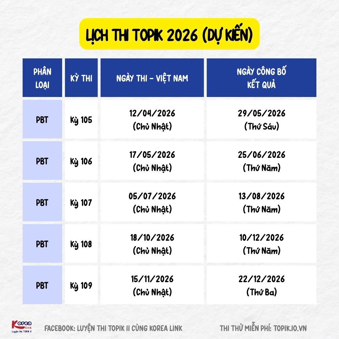 👉 Lịch thi TOPIK 2026 dự kiến như sau (thời gian có thể điều chỉnh, nhưng gần như cố định qua các năm):