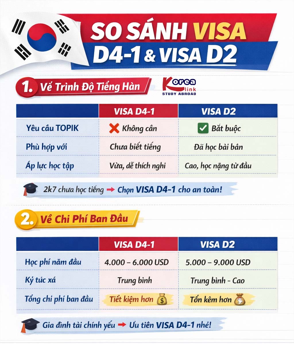 Khi tìm hiểu du học Hàn Quốc cho con, rất nhiều phụ huynh, học sinh băn khoăn: nên cho con đi học tiếng trước hay học chuyên ngành luôn? Vì vậy, hai loại visa thường được nhắc đến nhiều nhất là visa D4-1 và visa D2. Tuy nhiên, nếu không hiểu rõ sự khác nhau giữa hai diện này, phụ huynh, học sinh rất dễ chọn nhầm lộ trình, dẫn đến tốn kém chi phí, bạn học không theo kịp hoặc gặp nhiều áp lực khi sang Hàn.