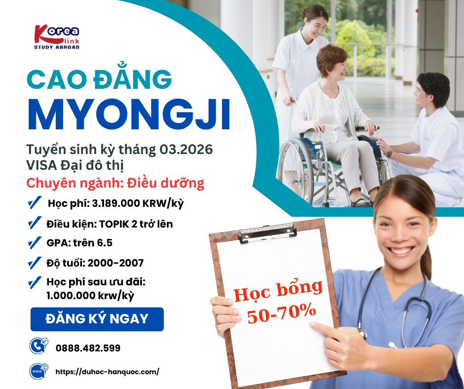 Du học Hàn Quốc 2026 cùng Cao đẳng MYONGJI – Seoul: Học ngành Phúc lợi xã hội – Điều dưỡng, nhận học bổng 50–70%, học phí chỉ từ 1.000.000 KRW/kỳ. Trường nằm tại quận Seodaemun, khu trung tâm Seoul, cấp Visa D2-1 đại đô thị trực tiếp, không cần phỏng vấn ĐSQ. Sau tốt nghiệp, sinh viên được bảo đảm việc làm 100%, chuyển Visa E7 và làm việc tại các viện dưỡng lão, trung tâm chăm sóc sức khỏe người cao tuổi.