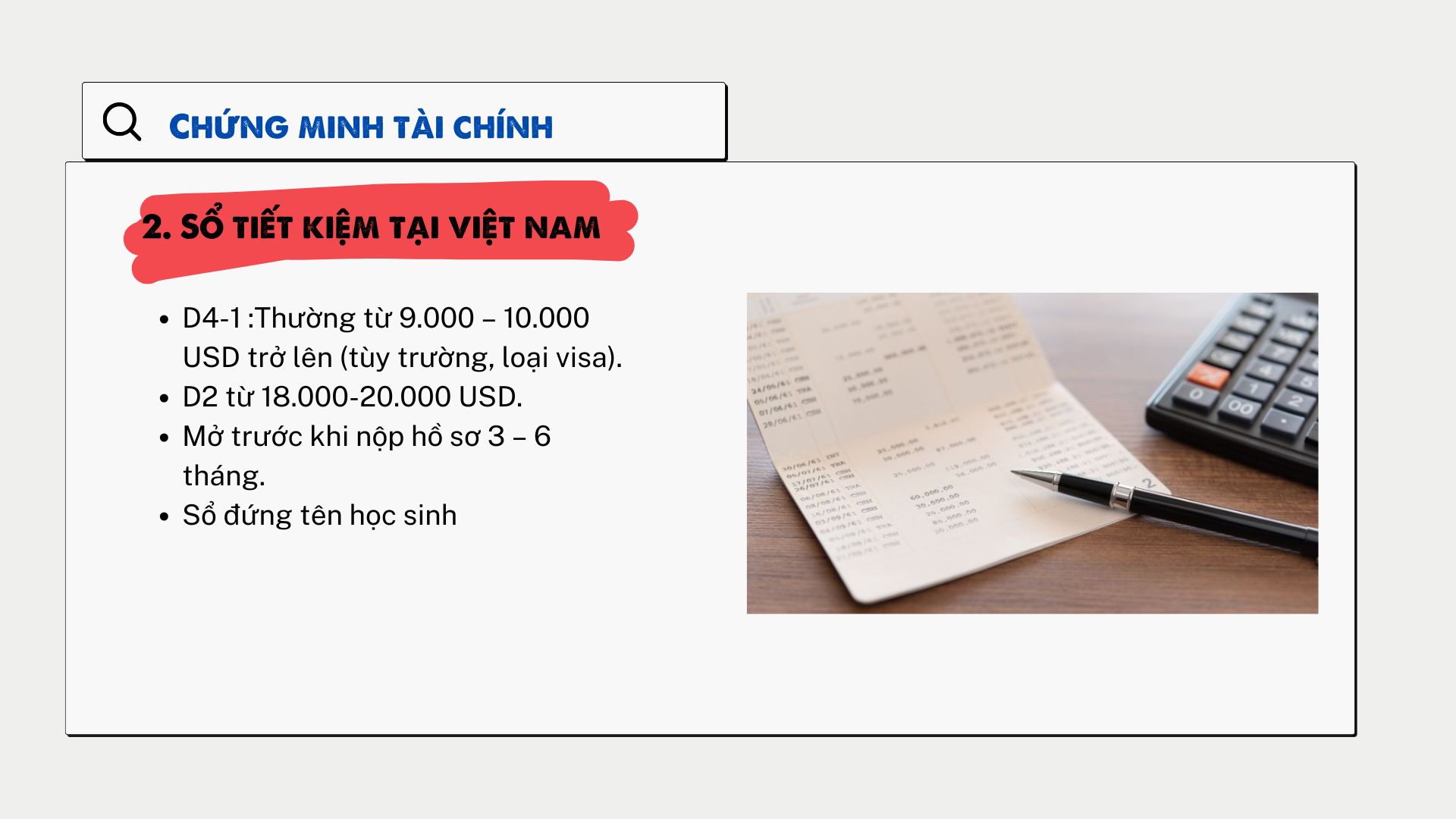 Khi làm hồ sơ du học, ngoài học lực và ngoại ngữ, tài chính là yếu tố quan trọng hàng đầu. Đại sứ quán và trường học cần thấy bằng chứng rõ ràng rằng bạn đủ điều kiện chi trả học phí, ăn ở, và chi tiêu trong suốt thời gian học.